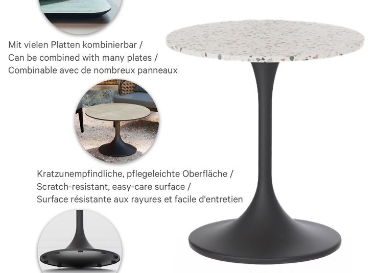 Caius is available as a coffee table and dining table, combining a floral, round design language with a classic yet modern style. Its minimalist and purist aesthetic adds timeless elegance to any interior. The easy-care surface and the satin-matte powder coating with fine texture not only provide an appealing look but also ensure long-lasting quality. Caius makes a great impression both indoors and outdoors.- can be combined with many tops