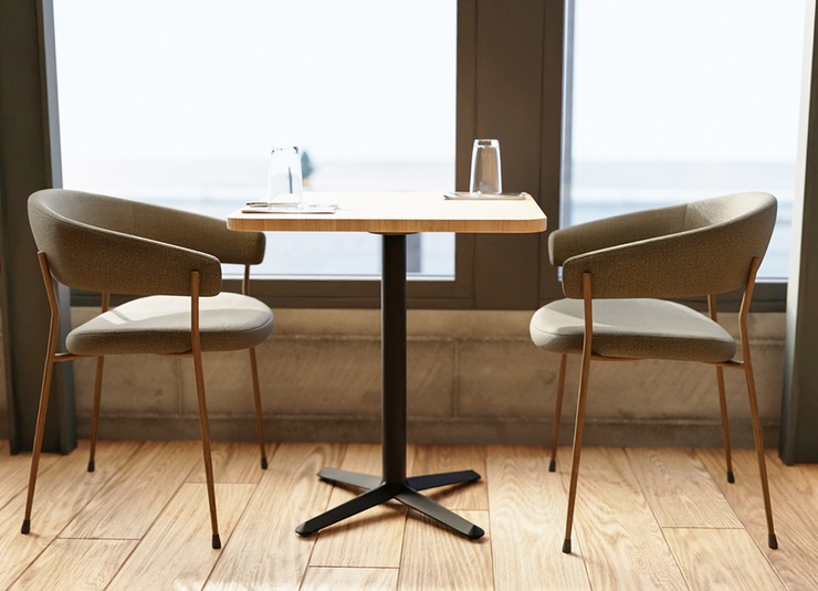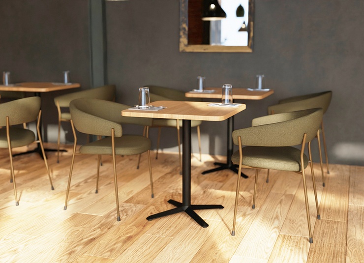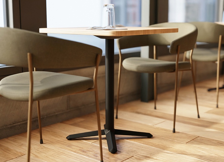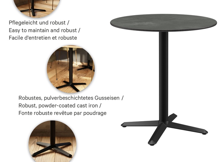 Kerno table base made of heavy cast iron, dip-coated in black – a simple all-rounder that ideally combines functionality and cost efficiency. The compact foot construction with toe feet appears visually discreet, offers ample legroom and reduces the risk of tripping during daily operation. Adjustable floor glides ensure a stable, wobble-free stand even on uneven floors. The robust, scratch-resistant and easy-care surface is ideal for intensive professional use, both indoors and outdoors. With optional additional weights, the base reliably and securely supports table tops up to 80 x 80 cm or 80 cm round.- Compact foot construction for legroom without tripping hazards