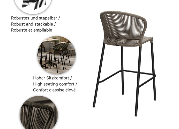 The Maruba series, consisting of: outdoor chair, armchair and barstool, impresses with a powder-coated aluminium frame that is robust, weather-resistant and easy to handle. The materials used are very easy to maintain and ideally suited for intensive contract and hospitality use. All versions are stackable and can be stored in a space-saving manner. The ergonomically shaped backrest ensures high sitting comfort – even over longer periods. Thanks to its classic-modern design, the series can be flexibly combined with many projects and offers a very attractive price-performance ratio.- Robust, stackable aluminium frame with very easy-care materials